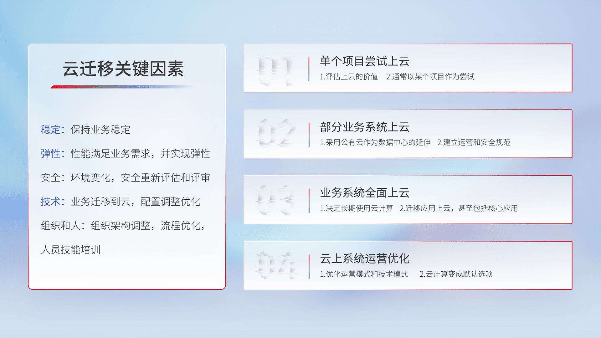 结合实际业务,,从规划设计、、、、云平台选型、、、云原生改造、、、数据迁移、、、集成交付,,,迁移全过程为客户识别最佳上云路径,,,,做好风险识别管理,,,设计网络架构、、身份权限、、安全审计合规、、、操作审计、、日志审计、、监控告警策略、、、多站点容灾设计等,,对云上基础设施进行整体规划,,,,提升IT治理水平,,以满足弹性、、高可用、、、高性能的需求。。。