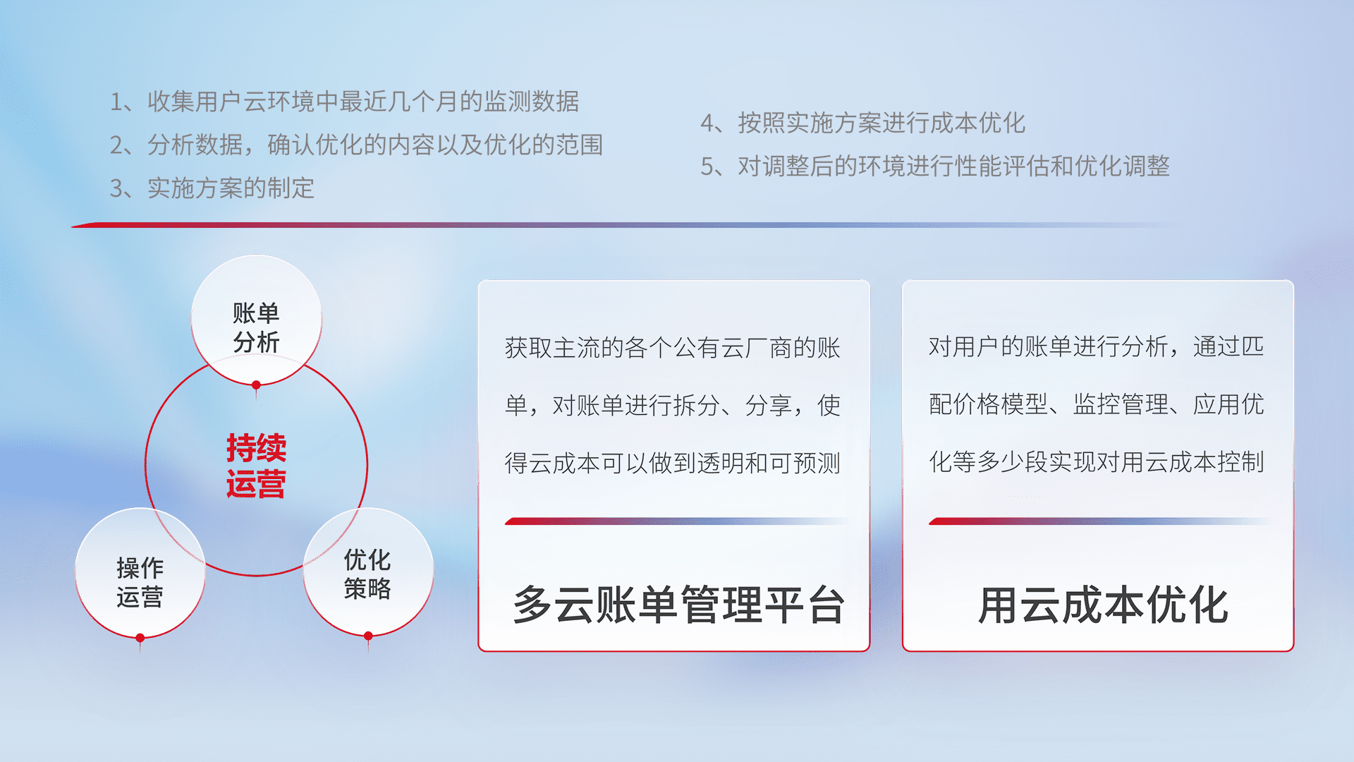 通过多云纳管,,,以统一的资源数据模型把客户的云资源进行抽象和封装,,,进而实现对多云资源的统一操作,,保障云资源管理的可靠性、、、、稳定性与可用性。。量身定制化运维内容,,,,配置、、开发运维、、、补丁管理、、、备份、、、监控、、、认证和访问管理、、、、审计和日常巡检等,,,,保障在用云过程中的可靠度,,,稳定度以及高可用率。。。。